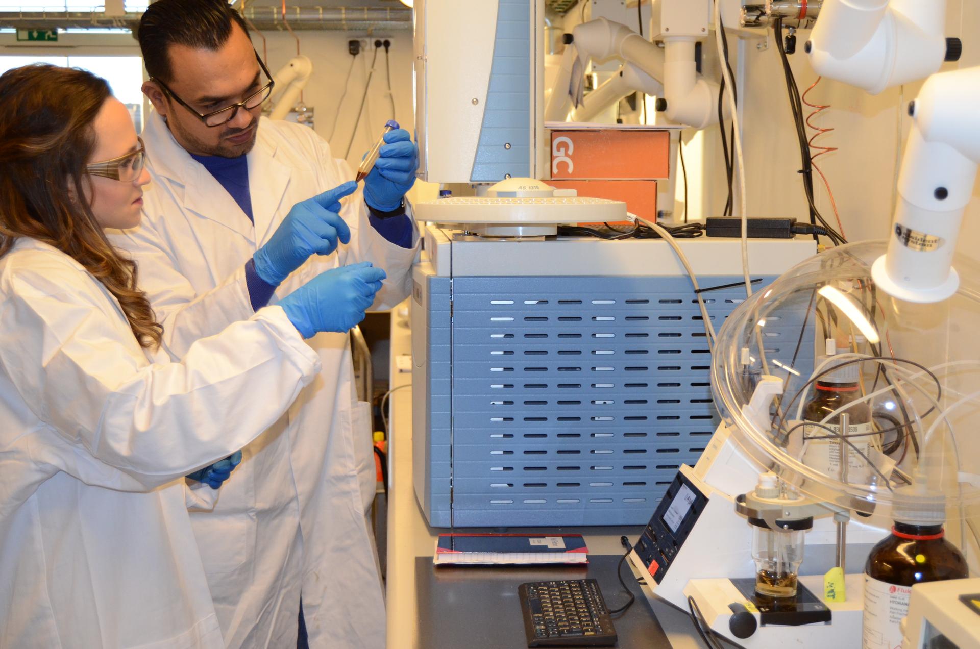 For sample analysis the lab has a GC/MS unit available. The system is used for the identification and quantification of components in feedstock and products.