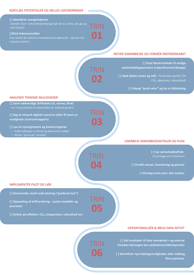 - Her er vores 6-trins guide til at kortlægge potentialer, finde partnere og implementere succesfulde sektorkoblingsprojekter.